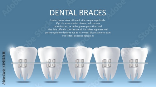 Шаблон баннера векторного плаката с зубными брекетами. Реалистичные белые зубы с металлическими брекетами. Ортодонтическое лечение, концепция коррекции прикуса.