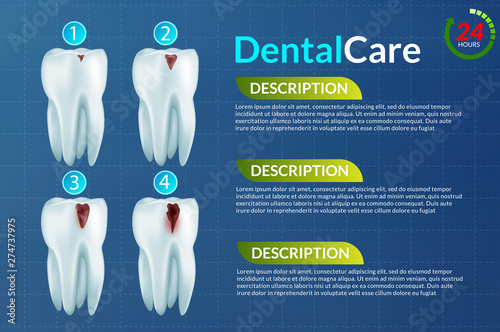 Шаблон баннера векторного медицинского плаката для лечения зубов. Реалистичные человеческие зубы и инструменты стоматолога. Концепция реставрации зубов или пломбирования.