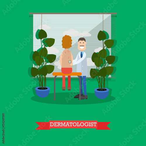 Векторная иллюстрация доктора-мужчины-дерматолога, осматривающего своего пациента. Интерьер медицинской клиники. Дизайн в плоском стиле.