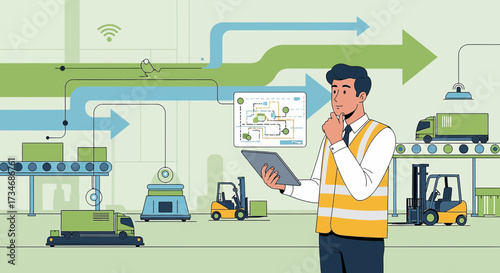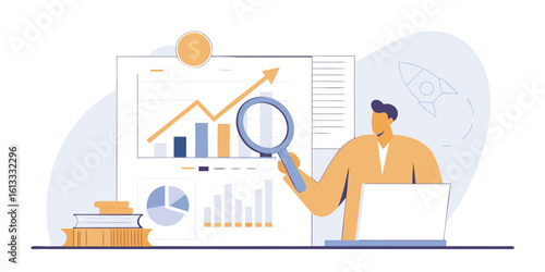 Профессиональный детективный онлайн-сервис или мобильное приложение с плоской векторной иллюстрацией. Агент, расследующий информацию о вещественных доказательствах в поисках улик. Инспектор на экране смартфона ищет убийцу