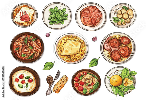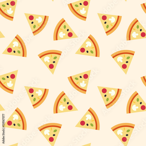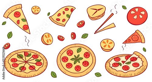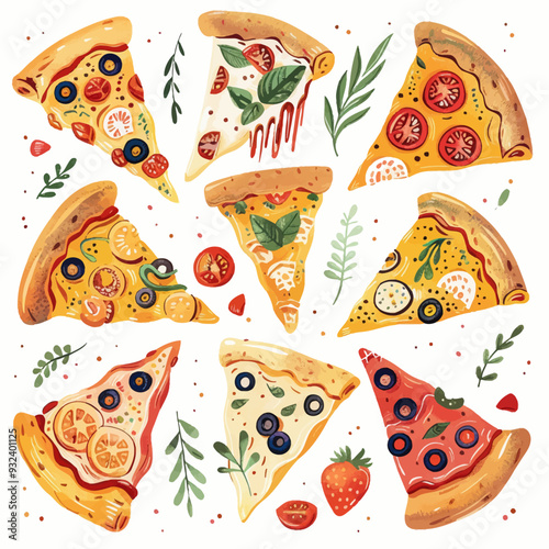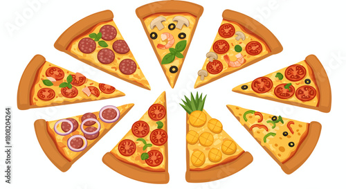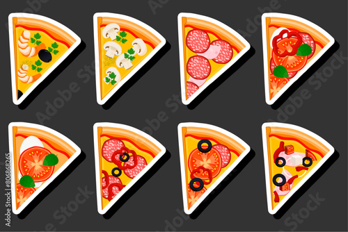 Различные ломтики итальянской пиццы векторная иллюстрация. Шаблон дизайна меню ресторана быстрого питания, пиццерии или кафе. Вегетарианская и традиционная закуска на обед или ужин