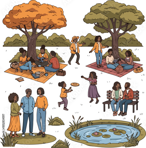 Персонажи разных людей прогуливаются по осеннему городскому парку под падающими листьями векторной иллюстрации. Мужчина и женщина идут на работу или учебу, разговаривают, слушают музыку. Сцена осеннего сезона