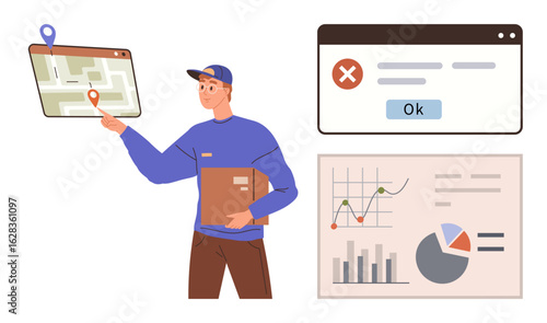 Вектор ранжирования различных сервисов. Иллюстрация отзывов клиентов и рейтинга мнений. Человек держит в руке смартфон с отчетом об опросе о репутации рабочего или строительной компании