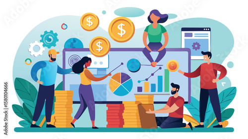 Огромный ноутбук, микро-бизнесмены с конвертом, лупой, поднятыми большими пальцами, как символ, мегафон, векторная иллюстрация. Реклама, бизнес-стратегия цифрового маркетинга, маркетинг по электронной почте и в социальных сетях.