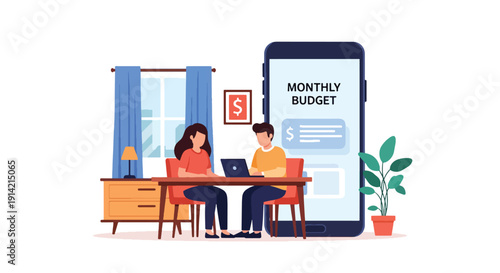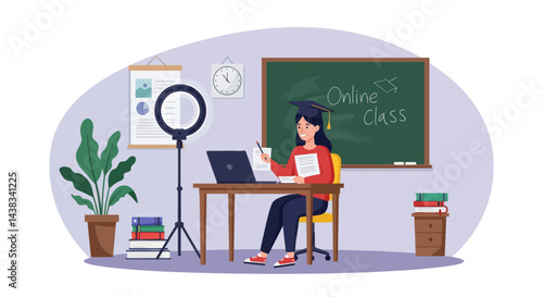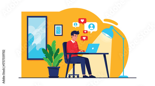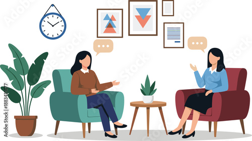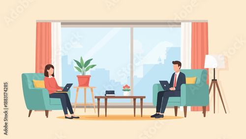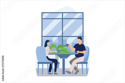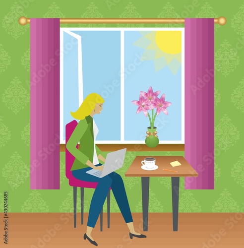 Интерьер столовой и девушка едят, сидя за столом у окна, векторная плоская иллюстрация. Уютная женская комната с мебелью и декором, современный домашний интерьер.