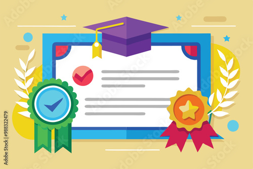 Диплом, денежный мешок, стопка книг с выпускной шляпой, плоская векторная иллюстрация. Стоимость обучения. Плата за обучение, ценность знаний. Инвестиции в образование. Ученость.