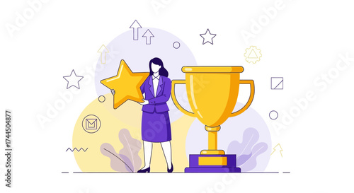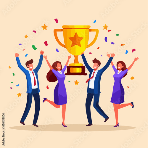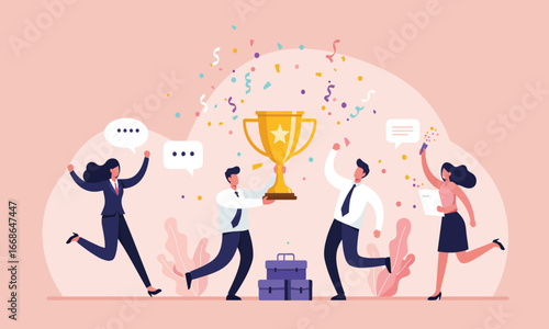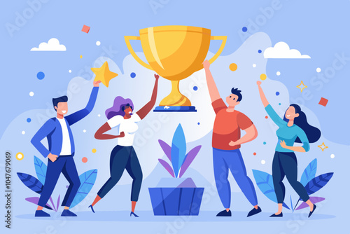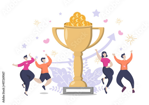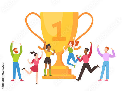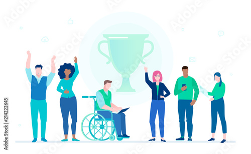 Счастливые мужчина и женщина в инвалидном кресле, держащие огромный золотой кубок трофея, векторная плоская иллюстрация. Люди с ограниченными возможностями празднуют победу, успех в бизнесе. Концепция достижения бизнес-цели.