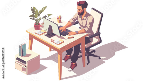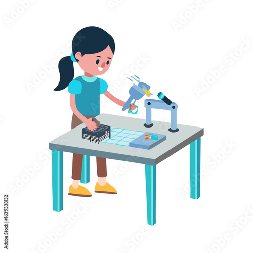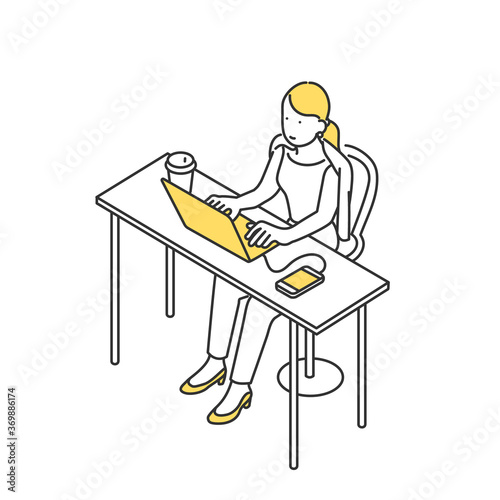 Женщина-инвалид с протезом кисти в векторе. Изометрический женский персонаж с бионической рукой, работающий за ноутбуком, сидя в инвалидной коляске. Образ жизни людей с ограниченными возможностями, выделенный на белом фоне