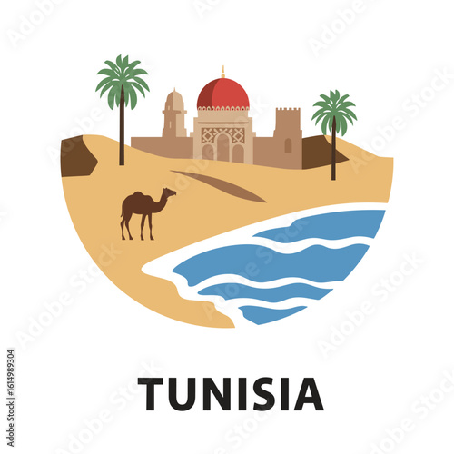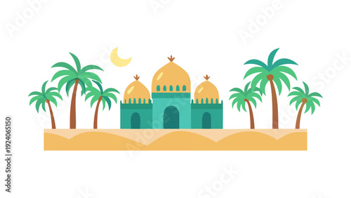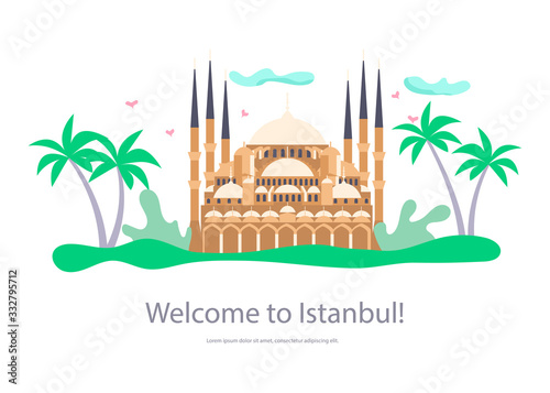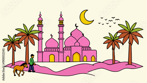 Откройте для себя новый мир векторной иллюстрации дизайна в плоском стиле. Концепция путешествия на Ближний Восток с путешествующей парой, фотографирующей знаменитые восточные достопримечательности для веб-баннера, страницы веб-сайта и т.д.