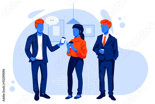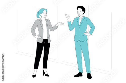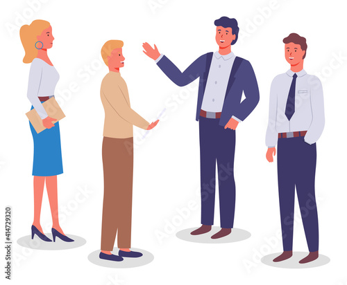 Вектор обсуждения. Люди проводят мозговой штурм, делятся идеей и находят блестящую иллюстрацию решения. Персонаж делового партнера разговаривает, разглагольствует и ведет приятную беседу