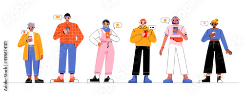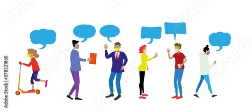 Разнообразные мультиэтнические молодые люди, держащие в руках набор речевых пузырей. Мужчина и женщина разных рас, стоящие в диалоговом окне чата в социальных сетях с поднятыми руками, векторная иллюстрация