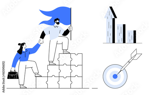 Исследователи Днк, ученые, лаборанты, изучающие гены, векторная плоская иллюстрация. Мужчина смотрит в микроскоп, женщина изучает структуру днк с помощью увеличительного стекла в научно-исследовательской лаборатории.