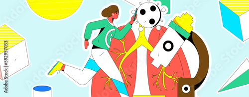 Доктор-дантист крошечные персонажи мужского и женского пола чистят зубы щеткой, сверля огромный зуб, плоская векторная иллюстрация. Лечение зубов и сервисное обслуживание, уход за полостью рта и гигиена, здоровье зубов.