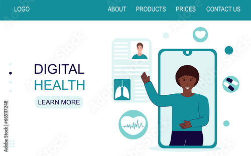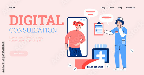 Векторный шаблон целевой страницы медицинского сайта "Доктор онлайн". Баннер веб-приложения для получения консультации в Интернете. Иллюстрация здравоохранения и медицины. Концепция электронного здравоохранения и телемедицины