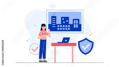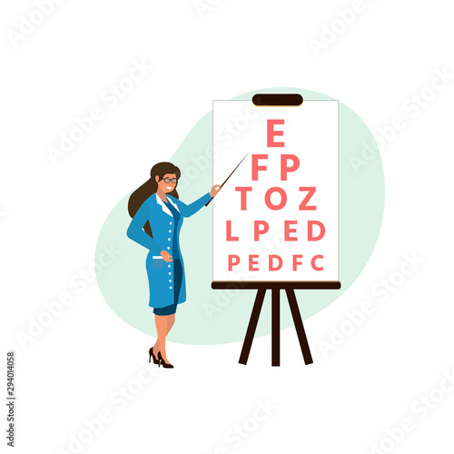 Врач-офтальмолог проверяет зрение, плоская векторная иллюстрация. Офтальмология, оптометрия, глазные тесты и коррекция зрения.