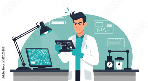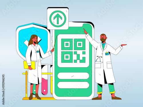 Проверка зрения врачом-офтальмологом, плоская векторная иллюстрация. Офтальмология, оптометрия, проверка зрения и коррекция зрения.