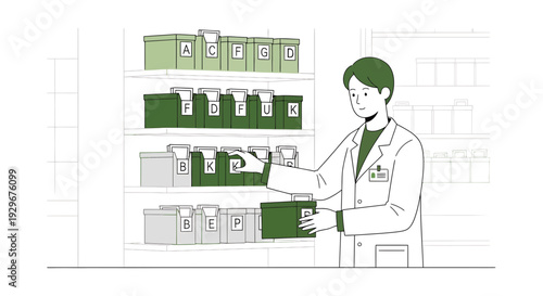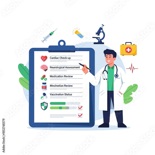 Врач-офтальмолог проверяет зрение, контактные линзы, глазные капли, плоская векторная иллюстрация. Проверка и коррекция зрения, здоровье глаз.
