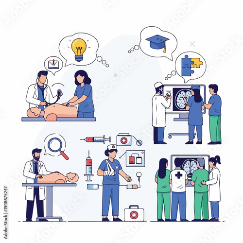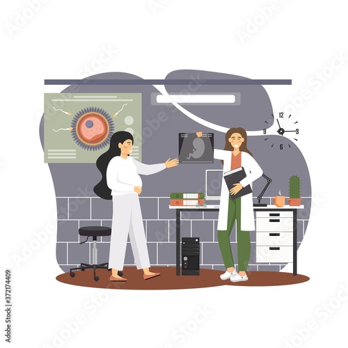 Врач показывает ультразвуковое сканирование счастливой беременной женщине, векторная плоская иллюстрация. Ультразвуковое исследование, сонография. Медицинская диагностика беременной женщины, дородовая медицинская помощь.