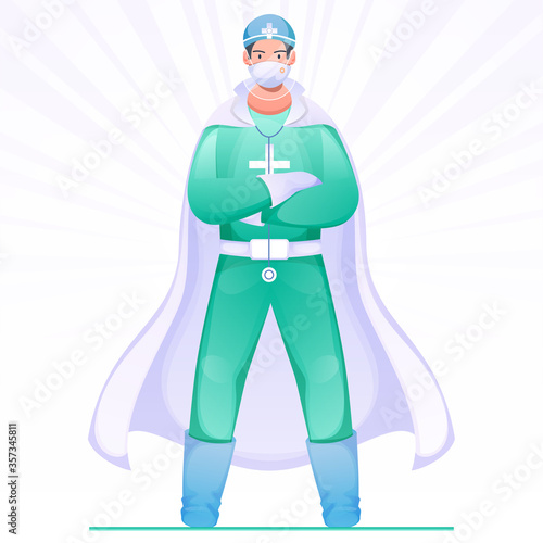 Вектор супергероя-доктора. Персонаж-медик-супергерой-храбрец в плаще и медицинской маске борется с болезнью, пандемией коронавируса, изолированной на белом фоне