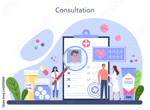 Команда врачей лечит пациента онлайн векторной иллюстрацией. Профессиональный терапевт, крошечный человек, делающий анализ крови, диагностирующий и лечащий, обсуждающий прогресс болезни