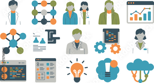Врачи используют технологию искусственного интеллекта в медицине для лечения больных людей. Искусственный интеллект с нейронными сетями помогает медикам в реанимации, лабораторных исследованиях или ультразвуковом обследовании. Векторная иллюстрация