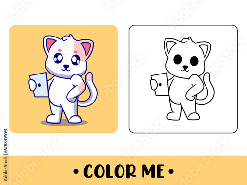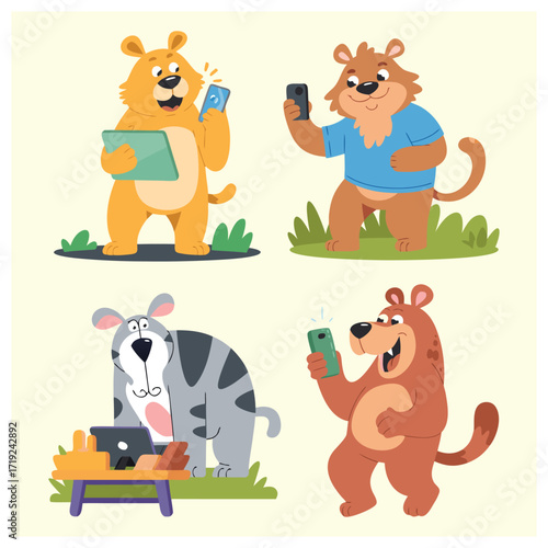 Забавный путешественник с собакой и кошкой, стоящий с паспортом рядом с векторной иллюстрацией кареты-клетки. Милый щенок и котенок в летних шортах отправляются в путешествие-приключение на тропический курорт в отпуске