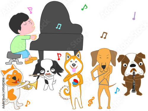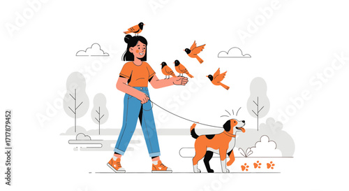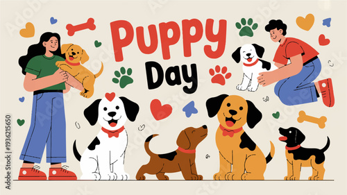 Векторная иллюстрация крошечных персонажей - владельца домашнего животного, держащего большую собаку на поводке, женщину с костью и другого мужчину с сухим кормом. Композиция товаров и принадлежностей для собак для сайта зоомагазина, веб-баннера и т.д.