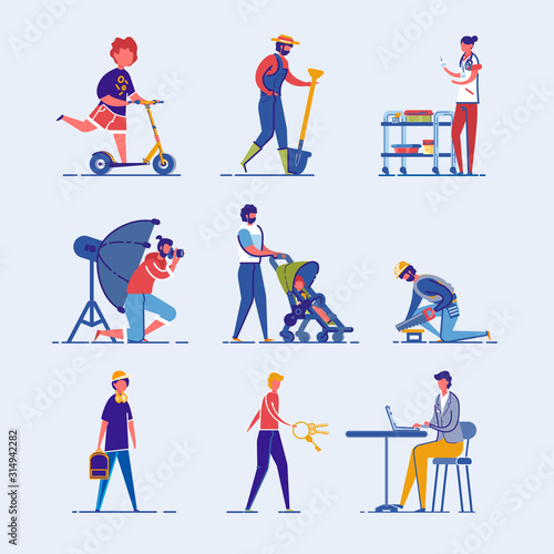 Кинологи учат домашних собак играть и выполнять трюки на детской площадке, векторная плоская иллюстрация. Изометрические мужские и женские персонажи, оборудование для дрессировки животных. Занятия по дрессировке собак на послушание.