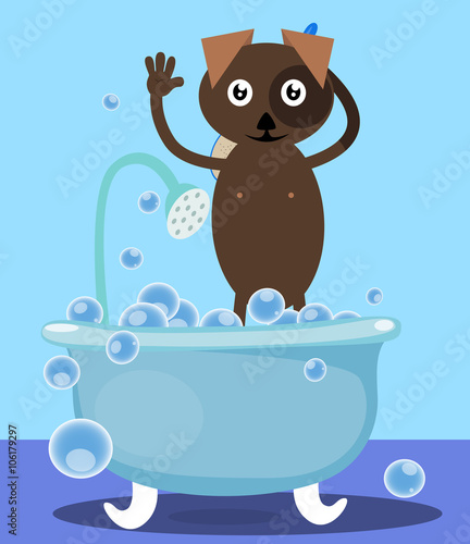 Мытье собаки в ванне. Мультяшный значок для ухода за домашними животными. Спа-салон для животных. милый щенок в ванне, наполненной водой и мыльным пузырем с шампунем, на белом фоне. Гигиена и уход за собаками