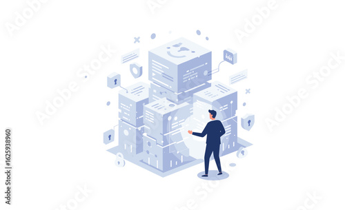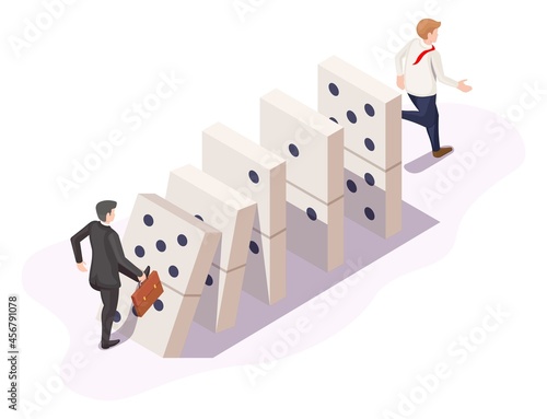 Эффект домино или цепная реакция в бизнесе, плоская векторная изометрическая иллюстрация. Бизнесмен, спасающийся от падающих костяшек домино. Неудача в бизнесе, концепция кризиса.