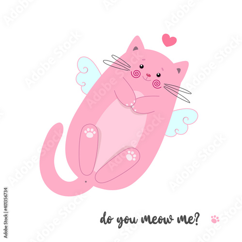 Векторное домашнее животное, милый мультяшный кот. Плоский животный персонаж со значком мечтательных эмоций. Забавный котенок прыгает, играя со смайликами, выделенными на белом фоне