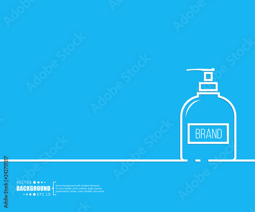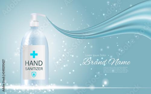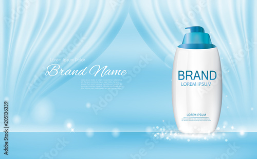 Векторная реалистичная иллюстрация рекламы питьевой прохладной воды. Пластиковая бутылка для чистой воды с этикеткой на синем фоне с пузырьками и кубиками льда.
