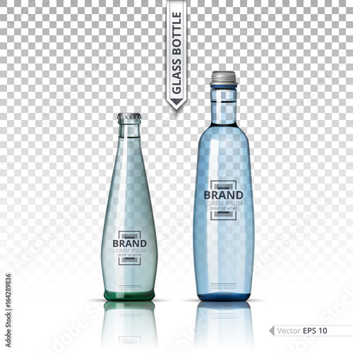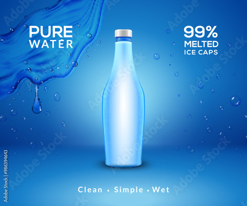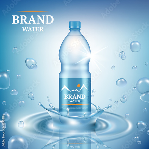 Шаблон дизайна рекламы питьевой воды. Векторные реалистичные пластиковые бутылки с минеральной водой вашего бренда на синем фоне с брызгами воды, каплями и кубиками льда.