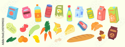 Напитки и закуски, набор значков продуктов торгового автомата. Векторная плоская изолированная иллюстрация. Фаст-фуд, чипсы, орехи, крекеры, печенье, сок, кола, содовая и т.д. Закуски и холодные напитки в упаковке.