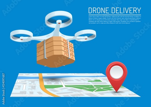 Векторная иллюстрация концепции доставки дронов. Квадрокоптер, несущий пакет с пиццей.