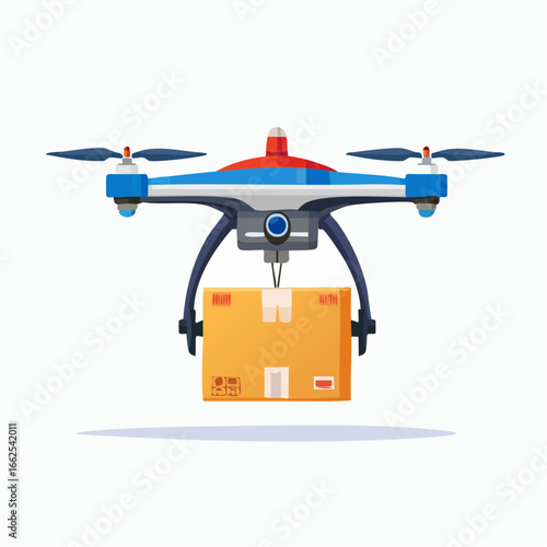 Доставка посылок дроном в изометрическом векторе. 3d квадрокоптер с парящей в воздухе коробкой на белом фоне. Доставка грузов самолетами, быстрая отправка грузов. Служба почтовой экспресс-доставки самолетами