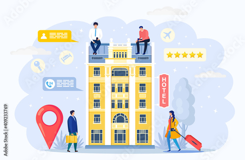 Беспилотник, летящий над городом, и микро-люди, несущие огромный ноутбук с городской фотографией на экране, векторная иллюстрация. Дистанционно управляемые летающие роботы, концепция технологии беспилотных летательных аппаратов для веб-баннерной страницы веб-сайта