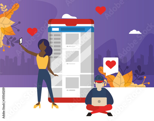 Большой город и мужские персонажи запускают беспилотник, векторная иллюстрация. Беспилотный летательный аппарат, концепция беспилотной технологии для веб-баннера, страницы веб-сайта и т.д.