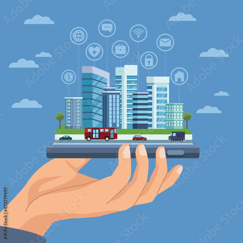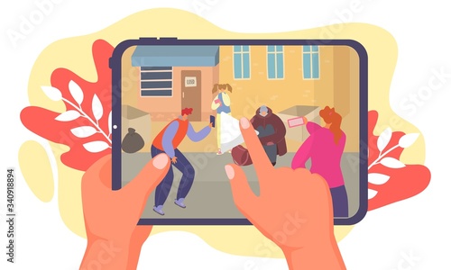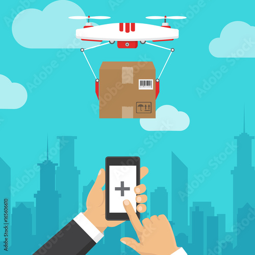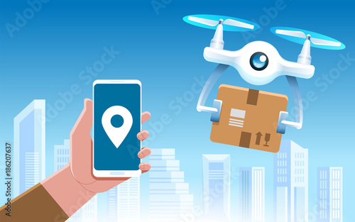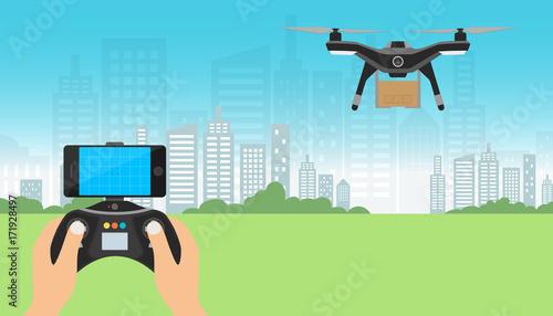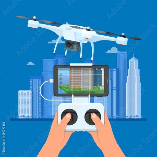 Беспилотник с дистанционным управлением летит над городом. Воздушный беспилотник с камерой, делающий фотографии и видео, векторная иллюстрация концепции.