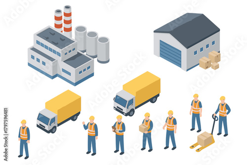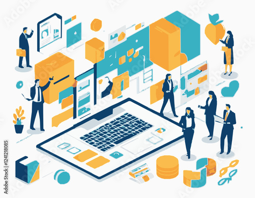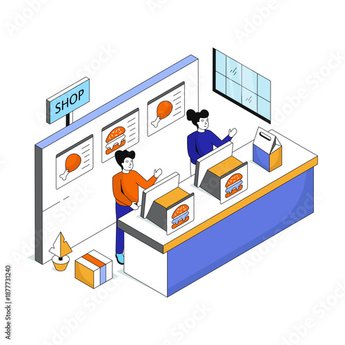 Набор значков аптеки, векторная плоская иллюстрация. Изометрическое здание аптечного магазина, прилавок, персонал, покупатели, флаконы с лекарствами, таблетки, капсулы, аптечка первой помощи, смартфон. Интернет-аптека и аптекарский магазин.