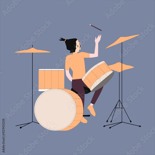 Векторная иконка барабанщика. Проигрыватель рок- или джазовой музыки изолирован. Персонаж-музыкант на белом фоне