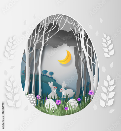 Пасхальное яйцо с силуэтом кролика, цветами и листьями, векторная иллюстрация в стиле бумажного искусства. Шаблон дизайна поздравительной открытки с Пасхой.