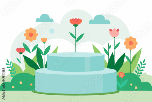 Макет подиума для демонстрации пасхальных товаров, кролик, вырезанный из бумаги, пасхальные яйца, весенние цветы, векторная иллюстрация. Фон весеннего праздника, пьедестал, сцена, студия.