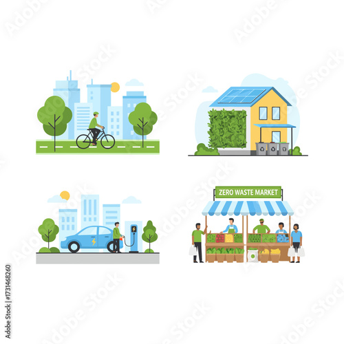 Набор эко-городского транспорта, плоская векторная иллюстрация. Люди катаются на роликовых коньках, скейтбординге, ездят на велосипеде, самокате, моноцикле, гироскутере. Городские самобалансирующиеся электрические скутеры. Активный образ жизни.