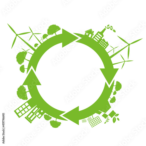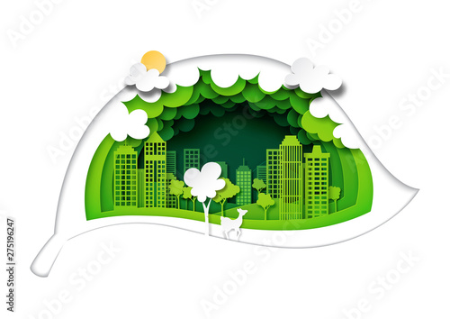 Экологически чистый зеленый город с ветряными турбинами и солнечными панелями, векторная иллюстрация в стиле бумажного искусства. Спасение мира и окружающей среды, альтернативная энергетика, концепция экологии.