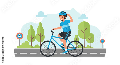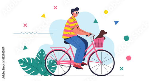 Экологичная доставка на велосипеде. Курьер в городском городском пейзаже. Иллюстрация концепции уик-энда дома. Векторный шаблон дизайна веб-сайта. Женщина ест сладости и смотрит телевизор.