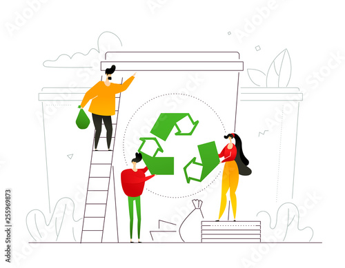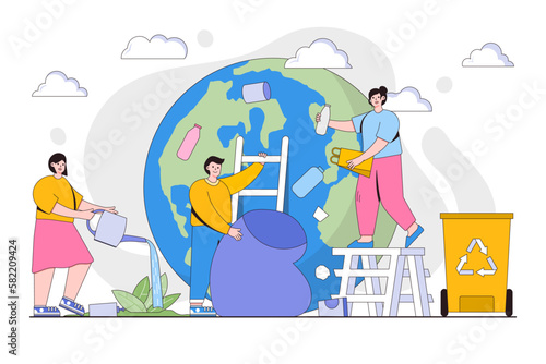 Экологически чистая композиция со счастливой женщиной, обнимающей зеленый глобус планеты Земля, векторная иллюстрация дизайна в плоском стиле. Спасите планету, сохранение окружающей среды, жизнь без пластика, экологичный образ жизни.