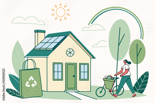 Векторная иллюстрация дизайна в плоском стиле ветряных турбин, солнечных панелей, лампочки, вилки, эко-транспортного велосипеда, флакона с зеленым ростком в руке. Концепция экологии для веб-баннера, страницы веб-сайта и т.д.