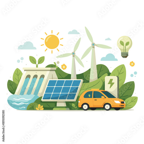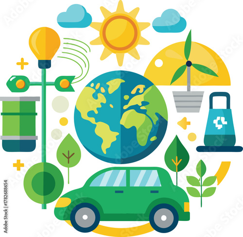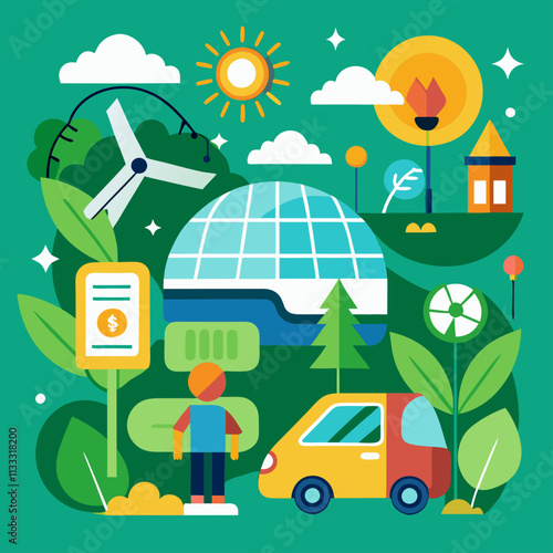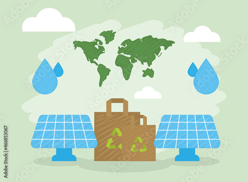 Векторная иллюстрация дизайна в плоском стиле планеты Земля и сумки с символами переработки, лампочка, подключенная к солнечным панелям и батарее, долларовые монеты. Концепция экологии для веб-баннера, страницы веб-сайта и т.д.