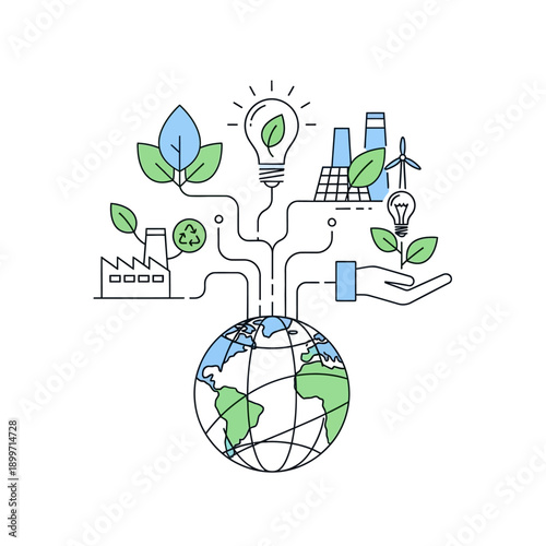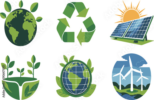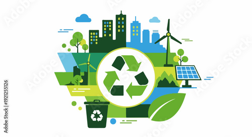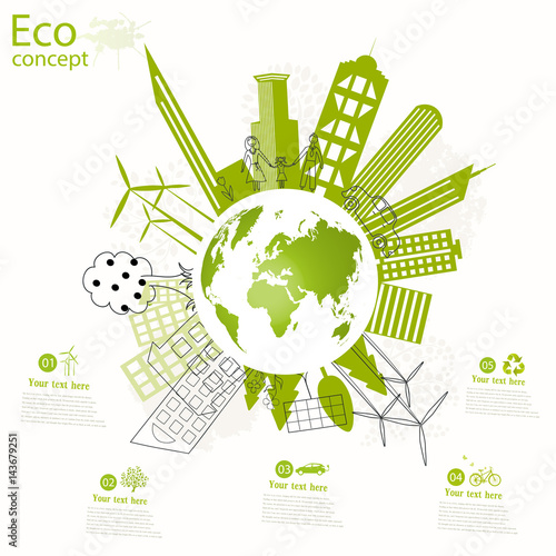 Экологическое слово с вырезанными из бумаги семейными персонажами, едущими на велосипедах с рюкзаками, экологически чистый город, солнечные батареи, ветряные мельницы. Векторная иллюстрация в стиле бумажного искусства. Шаблон баннера экологической типографии.